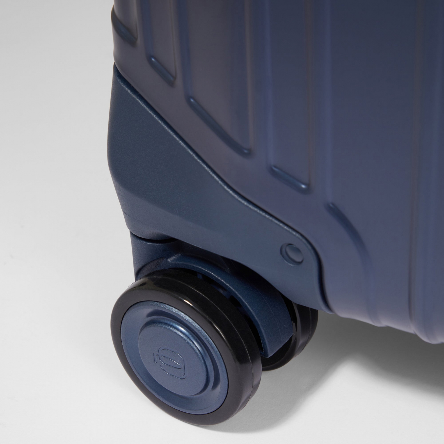 Премиальный алюминиевый чемодан из новой коллекции Piquadro Alu. Изготовлен из высококачественного и легкого анодированного алюминия с вставками из мелкозернистой телячьей кожи темно-синего цвета с фирменным голубым кантом, выглядит дорого и солидно. Чемодан оборудован четырьмя сдвоенными бесшумными колесами и двумя прочными защелками с кодовыми замками TSA. Внутри расположены отделения для вещей и удобные карманы на молниях. В комплекте прилагается кожаный брелок с трекером CONNEQU, позволяющий отслеживать местоположение чемодана в пределах 40 метров, также трекер подаст звуковой сигнал на Ваш смартфон, если Вы случайно оставите Ваш чемодан. Размер чемодана позволяет взять его в качестве ручной клади в салон самолета. Вес: 4,51 кг. Объем: 31 л.