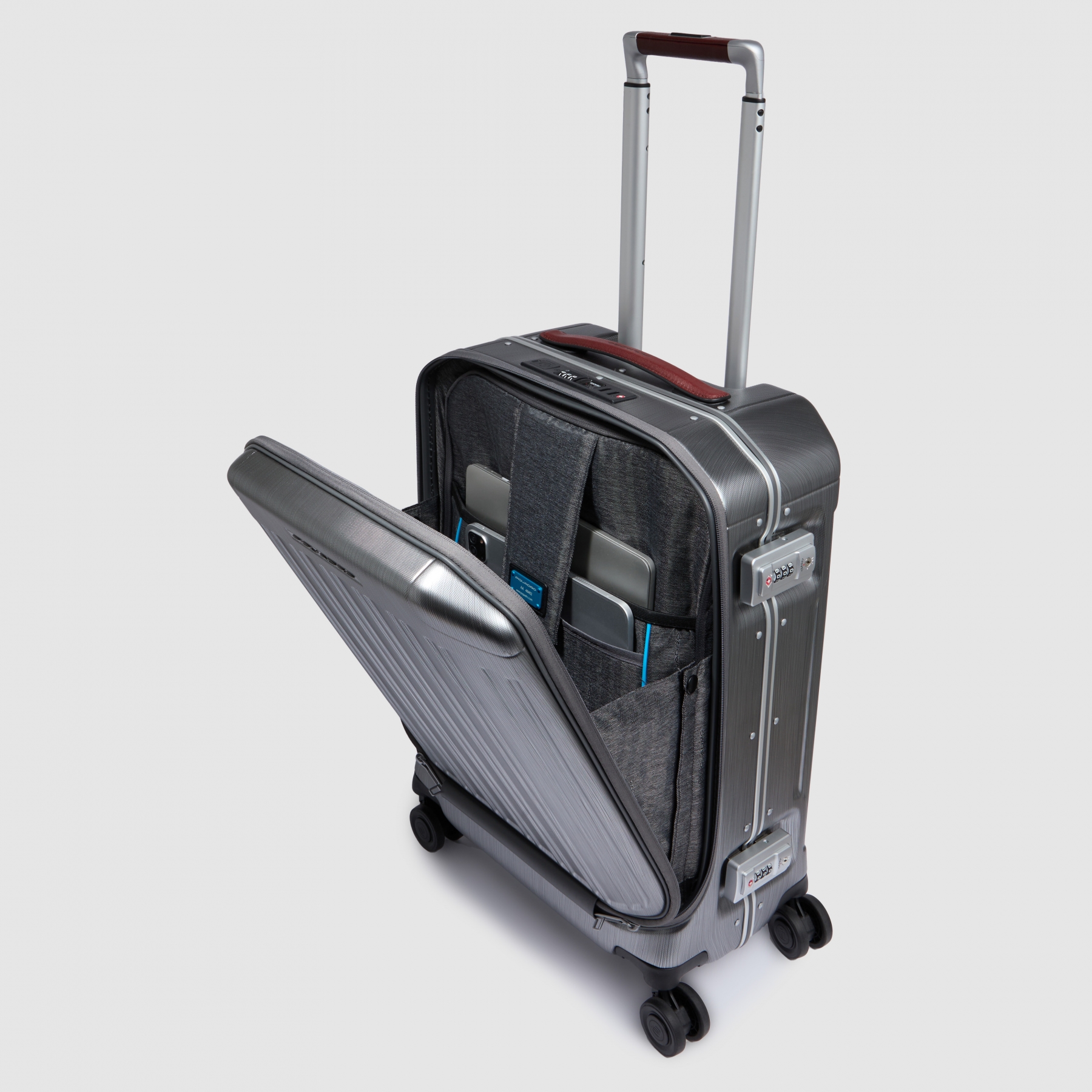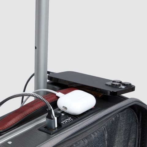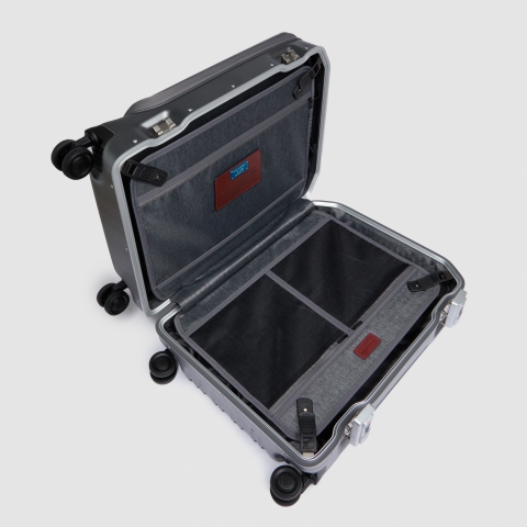 Стильный чемодан с отделением для ноутбука из коллекции Piquadro PQLM. Изготовлен из прочного, легкого и устойчивого к царапинам поликарбоната. Ручки чемодана отделаны высококачественной телячьей кожей табачного цвета. Основное отделение закрывается на защёлки с кодовым TSA замком. Большой карман на кодовом замке на передней части с противоударным отсеком для 17,3 дюймового ноутбука. Внешние выходы USB для зарядки гаджетов. Четыре сдвоенных и бесшумных колеса добавляют маневренности и надежности. Вес чемодана: 4 кг. Внутренний объем: 40 л. Идеальный вариант для непродолжительных бизнес-командировок и путешествий. Подходит в качестве ручной клади в большинстве авиакомпаний.