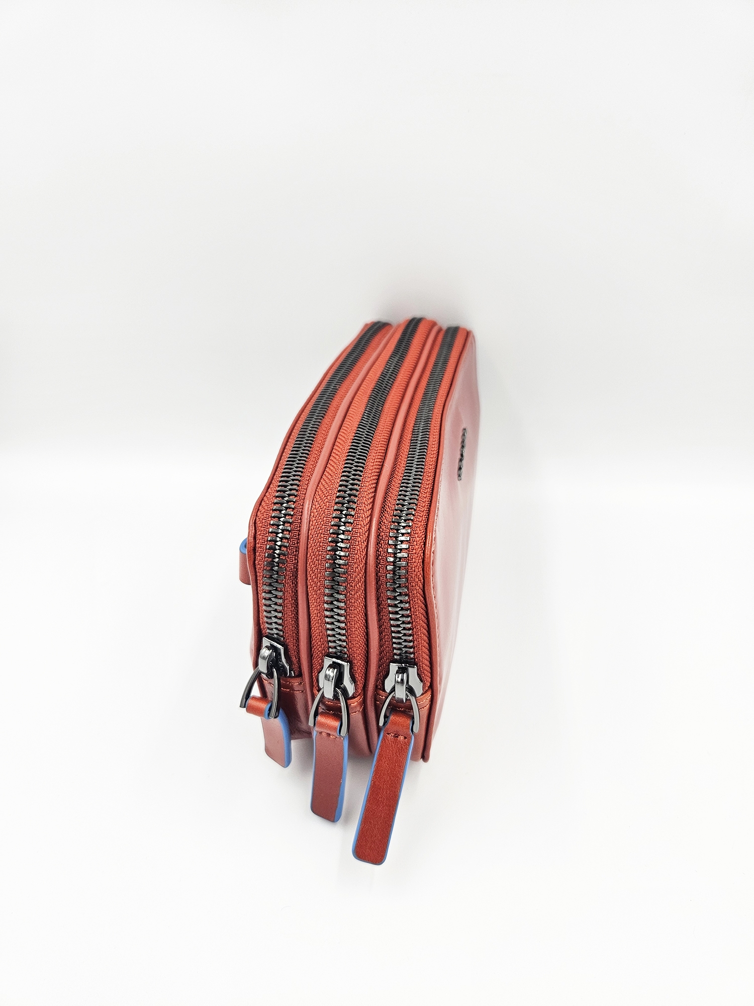 Кожаная барсетка из самой популярной коллекции Piquadro Blue Square. Изготовлена из гладкой телячьей, полуанилиновой кожи с фирменным голубым кантом. Барсетка имеет 3 отделения на молнии, в двух из них по 6 кармашков для банковских карт, в центральном отделении есть внутренний карман на молнии. В барсетку с легкостью помещается паспорт, водительское удостоверение, телефон и ключи. На задней стороне барсетки располагается крепление для ремешка на запястье и плечевого ремня. Выпускается в темно-синем, черном и коричневом цвете. Поставляется в транспортировочной коробке и пыльнике.