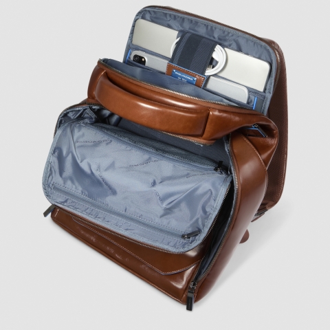 Новинка! Стильный кожаный рюкзак из самой популярной коллекции Piquadro Blue Square. Изготовлен из премиальной телячьей кожи с фирменным голубым кантом. Рюкзак имеет два отделения, одно из которых с защитным отсеком для 14 дюймового ноутбука и планшета, второе отделение полностью раскрывается и имеет карманы для телефона, наушников, письменных принадлежностей, а также карман на молнии. Спереди расположен большой карман на молнии, сзади, также карман и крепление на ручку чемодана. Идеальный вариант рюкзака, как на каждый день, так и для небольших поездок.