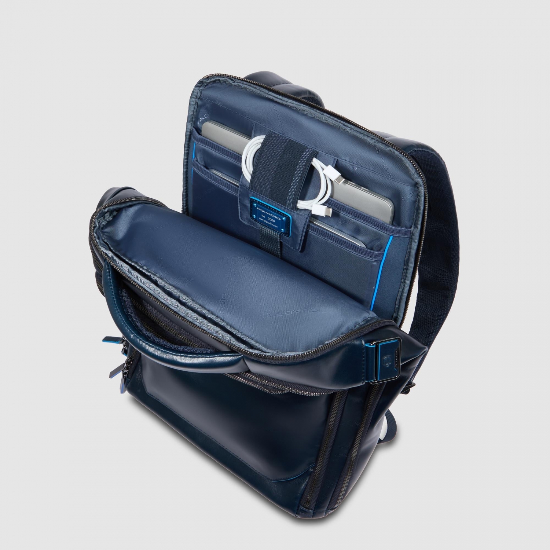 Новинка! Стильный кожаный рюкзак из самой популярной коллекции Piquadro Blue Square. Изготовлен из премиальной телячьей кожи с фирменным голубым кантом. Рюкзак имеет три отделения, одно из которых с защитным отсеком для 15,6 дюймового ноутбука и планшета, другое с органайзером для небольших вещей, а третье отделение раскрывается на 180 градусов. Спереди расположен большой карман на молнии, сзади, также карман и крепление на ручку чемодана. Идеальный вариант рюкзака, как на каждый день, так и для небольших поездок. Объем: 18,5 л. Вес: 1590 гр.