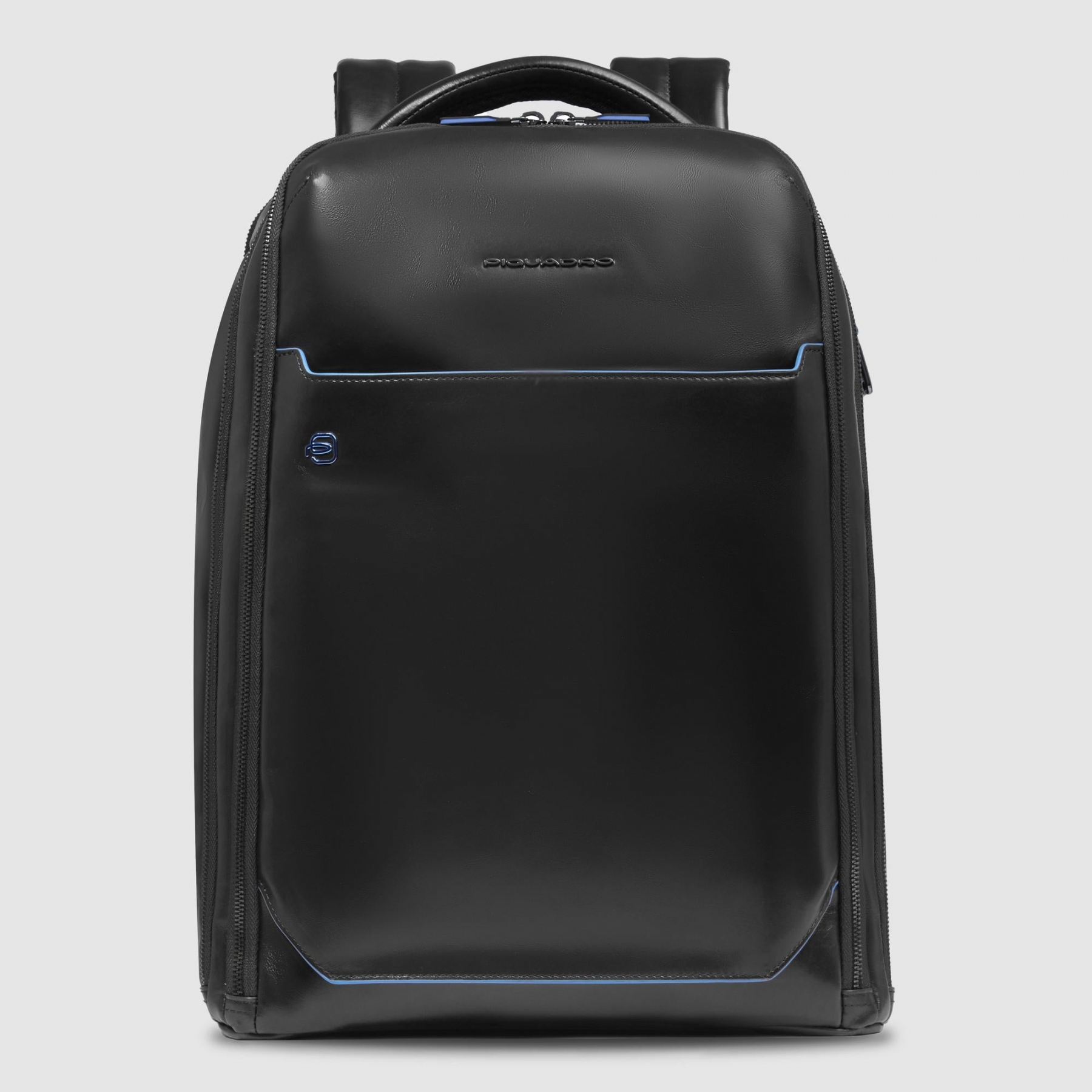 Новинка! Стильный кожаный рюкзак из самой популярной коллекции Piquadro Blue Square. Изготовлен из премиальной телячьей кожи с фирменным голубым кантом. Рюкзак имеет три отделения, одно из которых с защитным отсеком для 15,6 дюймового ноутбука и планшета, другое с органайзером для небольших вещей, а третье отделение раскрывается на 180 градусов. Спереди расположен большой карман на молнии, сзади, также карман и крепление на ручку чемодана. Идеальный вариант рюкзака, как на каждый день, так и для небольших поездок. Объем: 18,5 л. Вес: 1590 гр.