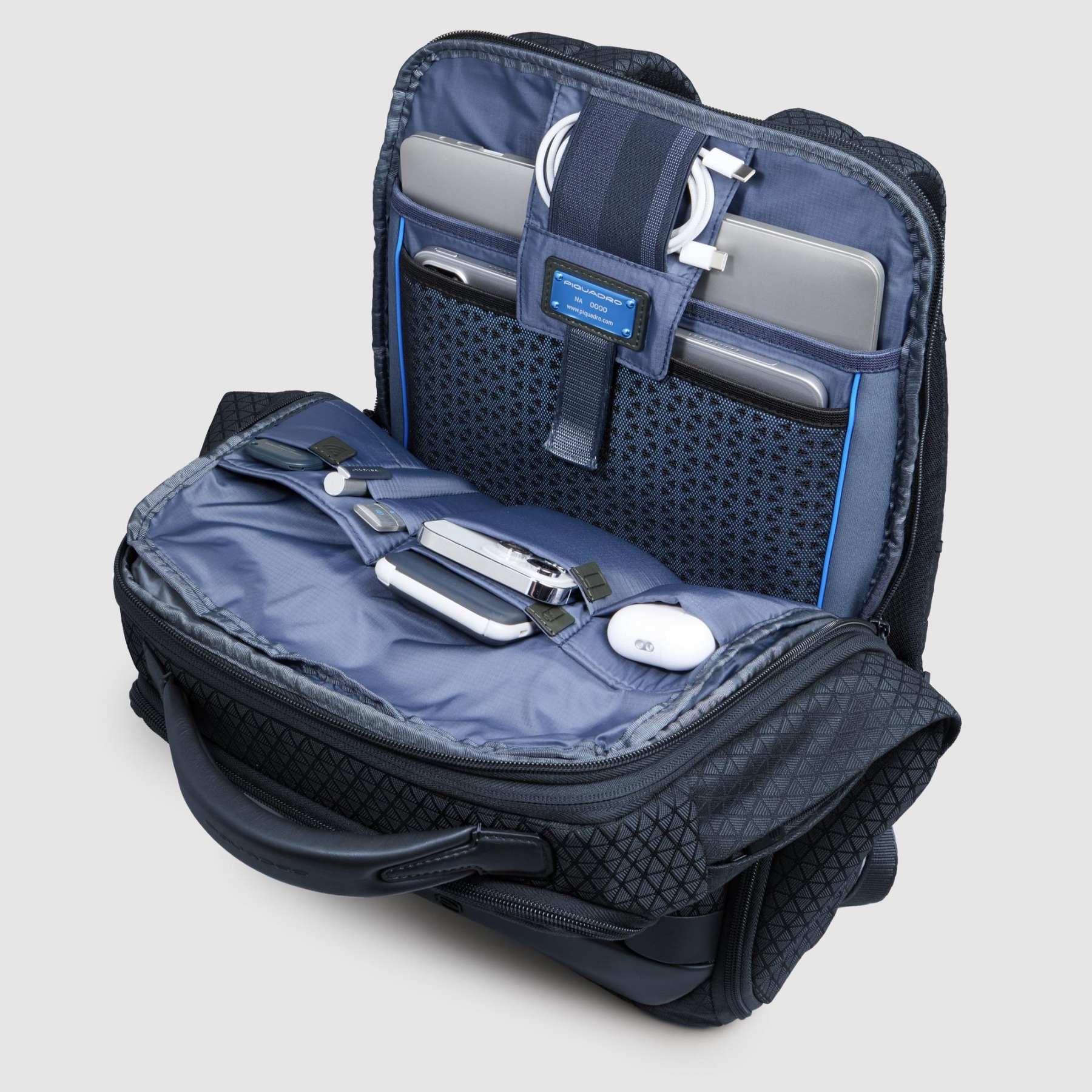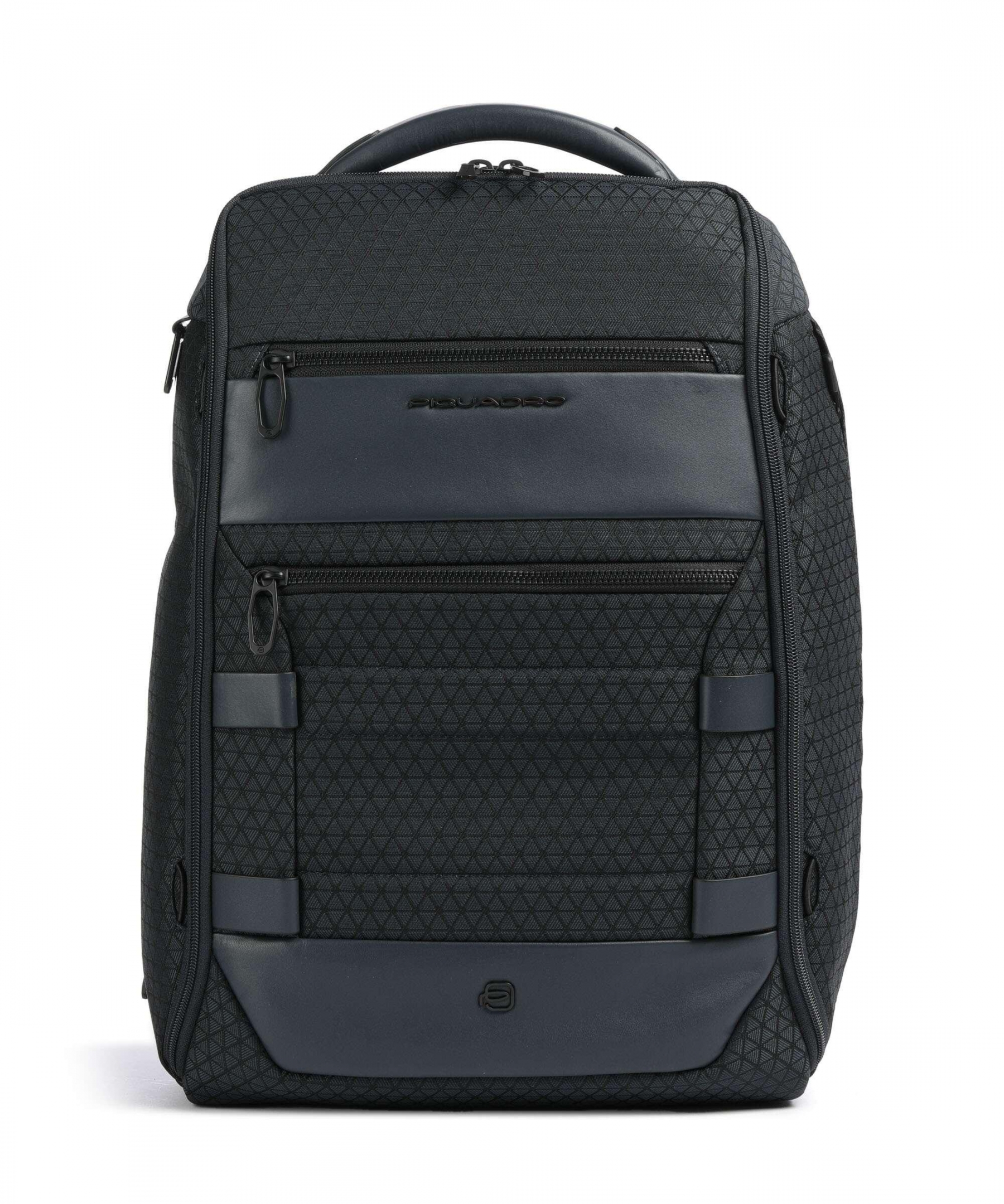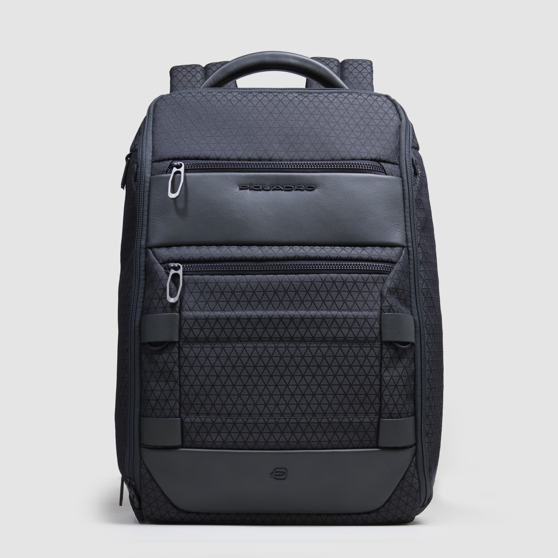 Стильный рюкзак для поездок и путешествий из сезонной коллекции Piquadro HEXAGON. Изготовлен из высокотехнологичной и высокопрочной ткани, 91% полиэстер, 8 полиуретан, имеющей также влагоотталкивающие свойства. Материал запатентован, каждый треугольник имеет разный рисунок стяжка, что создает уникальный внешний вид. Рюкзак имеет отделение для планшета и 15,6 дюймового ноутбука, кармашки для письменных принадлежностей. Другое отделение с натяжными ремнями для вещей и со съемным органайзером для вещей и аксессуаров. На задней части карман на молнии с RFID защитой для портмоне и крепление на чемодан. Молнии с защитой от открытия. Рюкзак также имеет возможность увеличения внутреннего объема. Объем: 31 л.