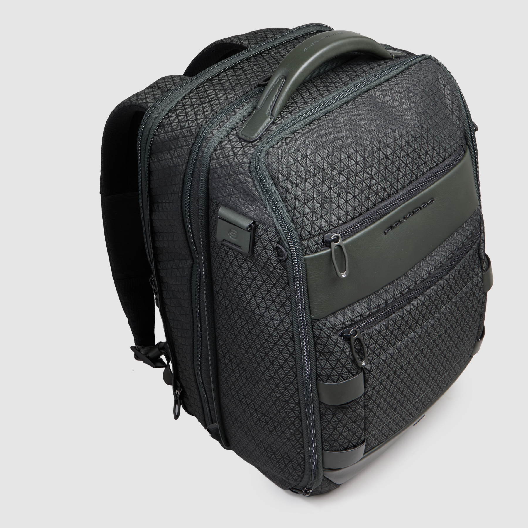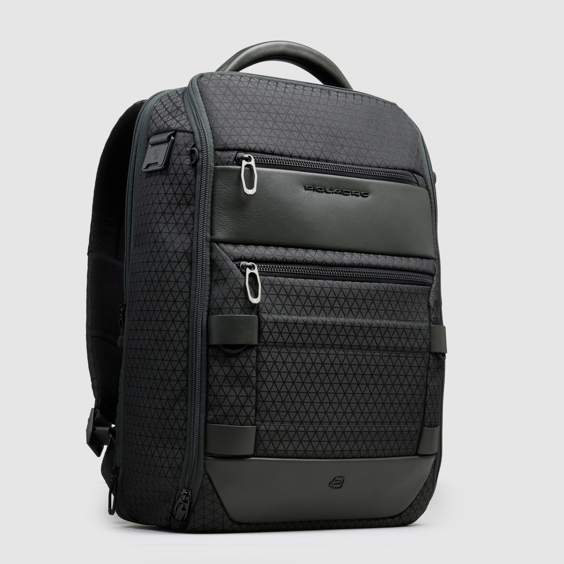 Стильный рюкзак для поездок и путешествий из сезонной коллекции Piquadro HEXAGON. Изготовлен из высокотехнологичной и высокопрочной ткани, 91% полиэстер, 8 полиуретан, имеющей также влагоотталкивающие свойства. Материал запатентован, каждый треугольник имеет разный рисунок стяжка, что создает уникальный внешний вид. Рюкзак имеет отделение для планшета и 15,6 дюймового ноутбука, кармашки для письменных принадлежностей. Другое отделение с натяжными ремнями для вещей и со съемным органайзером для вещей и аксессуаров. На задней части карман на молнии с RFID защитой для портмоне и крепление на чемодан. Молнии с защитой от открытия. Рюкзак также имеет возможность увеличения внутреннего объема. Объем: 31 л.