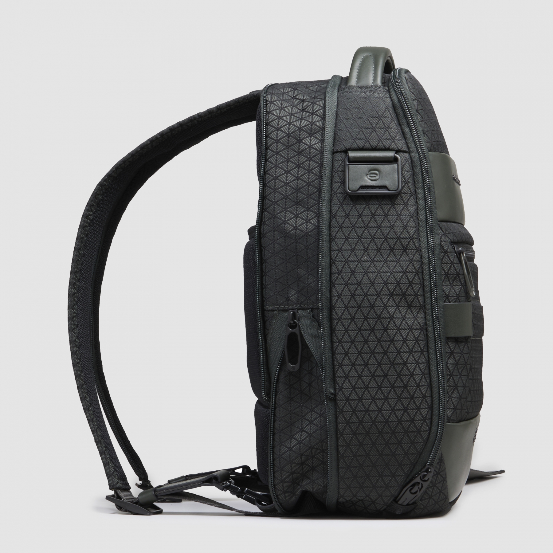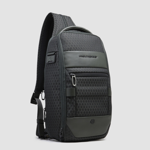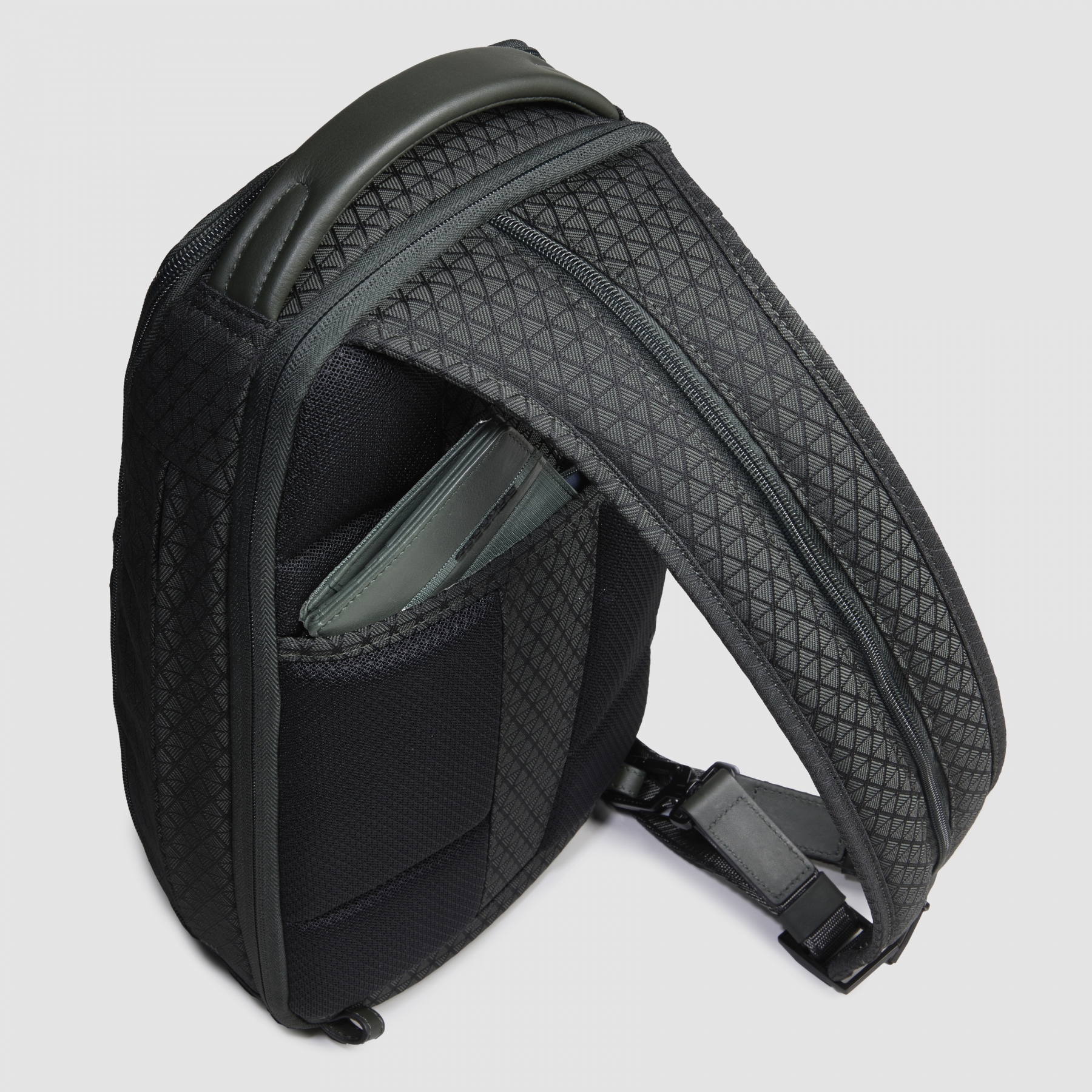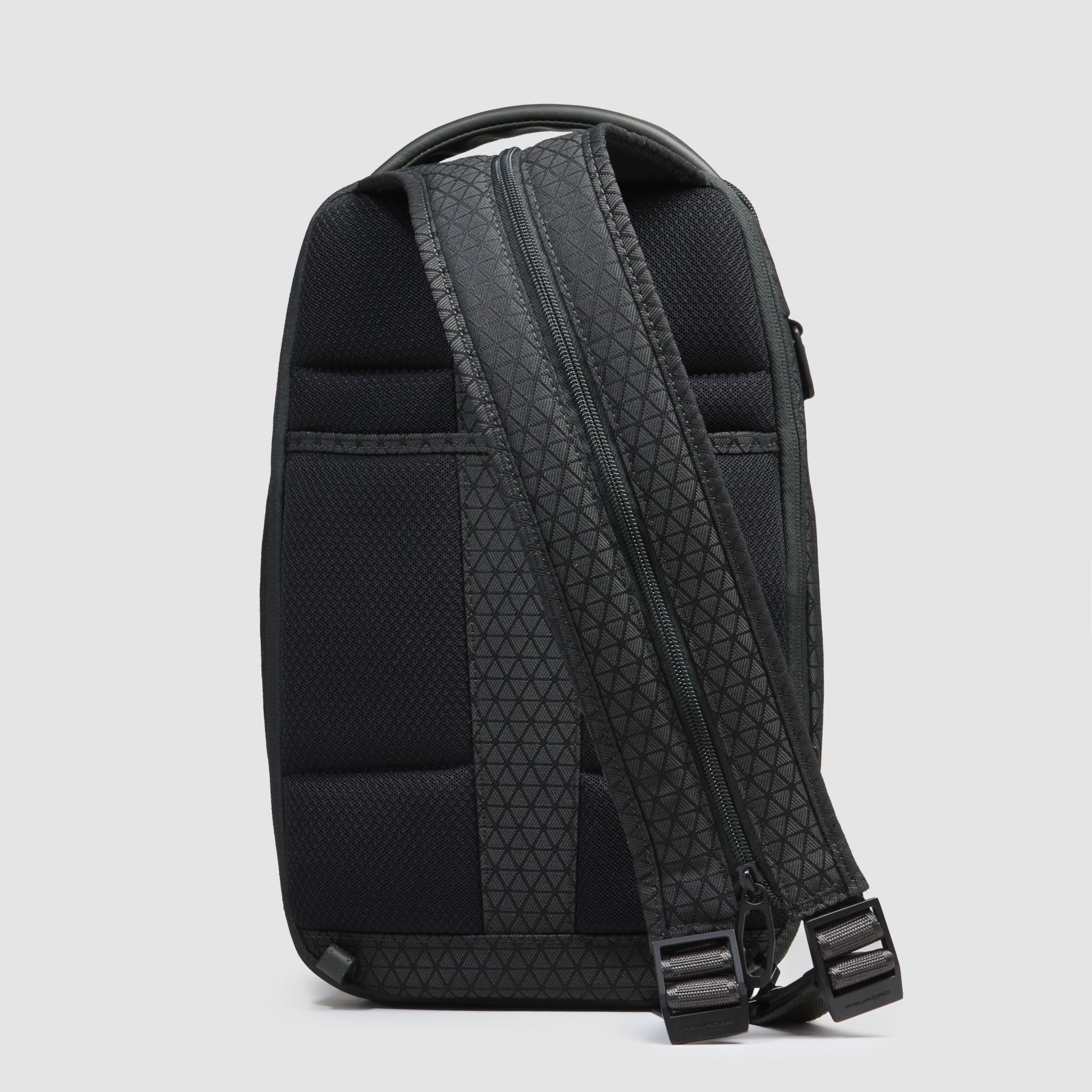 Рюкзак с одной лямкой из сезонной коллекции Piquadro HEXAGON. Изготовлен из высокотехнологичной и высокопрочной ткани, 91% полиэстер, 8 полиуретан, имеющей также влагоотталкивающие свойства. Материал запатентован, каждый треугольник имеет разный рисунок стяжка, что создает уникальный внешний вид. Рюзкак имеет отделение для планшета Porta iPad® 10,2''Air 10,9''Pro 11'' и письменных принадлежностей, карман для портмоне с RFID защитой, сдвоенную лямку, молнии с защитой от открытия и возможность увеличения внутреннего объема.